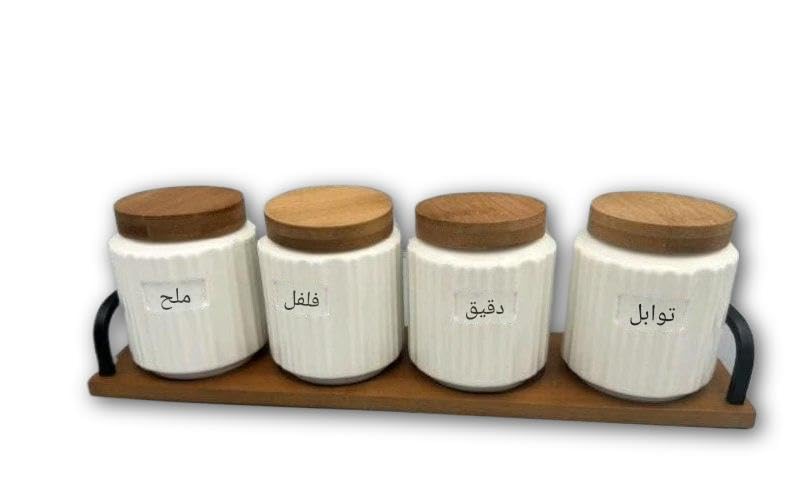 Generic - Kitchen Decor - Farmhouse Ceramic Jars with Bamboo Lids, 4 White Containers on Wooden Tray, Ideal for Salt, Pepper, Flour, and Spice Storage in Modern Homes
