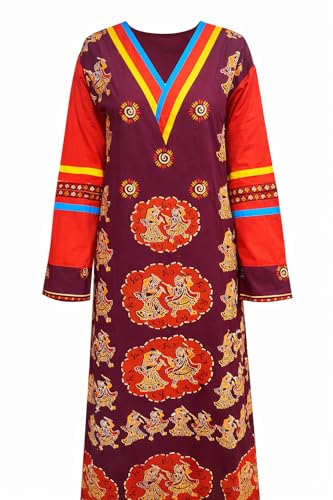 Generic - Lamasaty Women’s Printed Maxi Abaya – Burgundy Modest Dress with Ethnic Dance Motif & Color Block Sleeves (L)