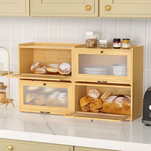 - [ Large Capacity Design ] 1) The kitchen counter top bread box measures 15.8" x 9.1" x 9.5" and can be stacked in two or more layers, the kitchen counter top bread box is suitable for home, kitchen, bakery. 2) An easy to move cutting board has been added to the bottom of the bread storage box for slicing bread and holding bread