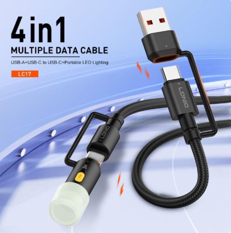 LDNIO - Ldnio LC17 65W Fast Charging Cable (USB-A & USB-C to USB-C) Power Delivery Cable with LED Light, High-Speed Data Sync Cord for Mobile Phones, Tablets, Laptops – Durable & Portable - Black