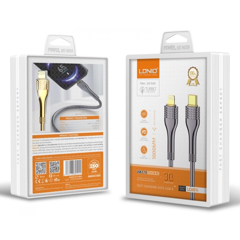 LDNIO - كابل شحن سريع LC651i (USB نوع C إلى لايتنينج) 30 وات ويدعم PD / QC لأجهزة آيفون واي باد وآبل من لدنيو، مزامنة بيانات عالية السرعة وتصميم متين، كابل شحن الموبايل - لون ذهبي