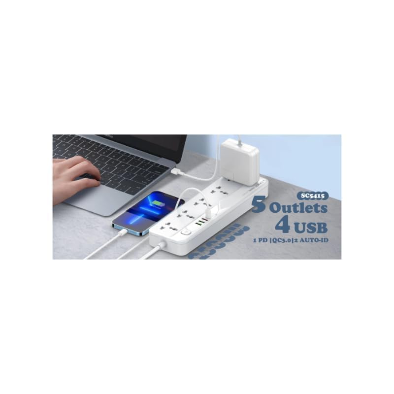 LDNIO - مشترك كهرباء عالمي SC5415 مع 4 منافذ USB PD/QC 3.0 طاقة 20 وات و5 منافذ وزر تبديل من لدنيو - 2500 وات - أبيض