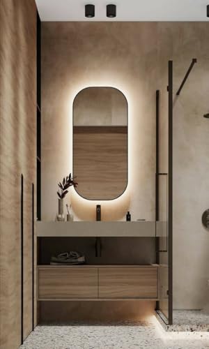 - MODERN DESIGN: Features an elegant rounded rectangular mirror with integrated LED backlighting that creates a warm ambient glow, perfect for contemporary bathroom aesthetics