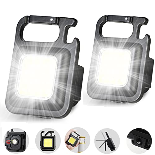 - 🌟MULTI-FUNCTIONAL PORTABLE DESIGN: The small keychain flashlight have 3 Lighting Modes, with SOS function, and square design. The lep flashlight top is a climbing buckle design can be hung in any position you want to, and with a bottle opener function to help you open a variety of metal lids in the field, the back is 180 ° rotatable bracket, the COB light put on the ground can also be used steadily.