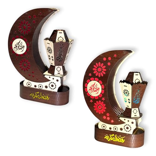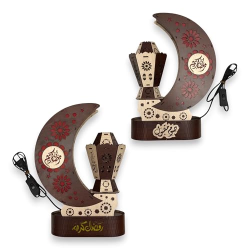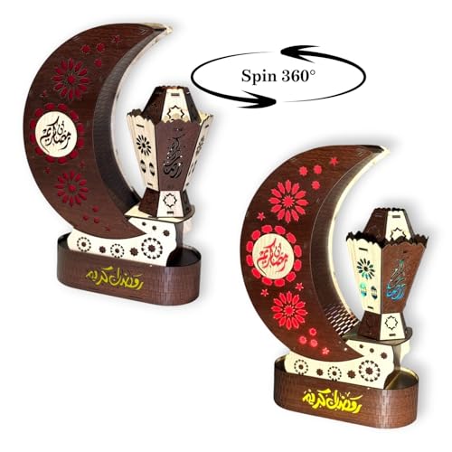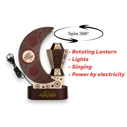 Woodiano - Lighted Ramadan Crescent with Spinning Lantern – Wooden Ramadan Decor on 360° Rotating Base, Electric Powered with Light & Music (Brown)
