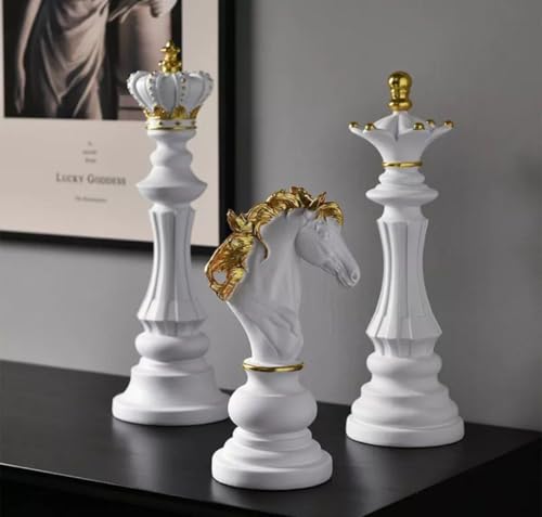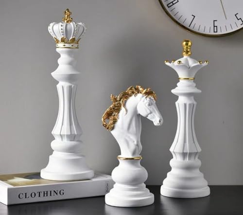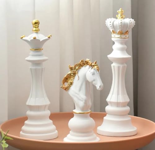 - مجموعة ديكور: تتكون من ثلاث قطع شطرنج تزيينية أنيقة بتصميم كلاسيكي مع لمسات ذهبية وبيضاء