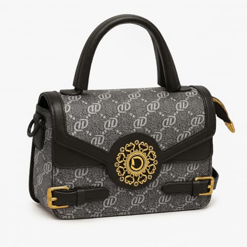 حقيبة يد نسائية فاخرة، تصميم كلاسيكي، نقش مميز، لون رمادي وأسود مع تفاصيل ذهبية