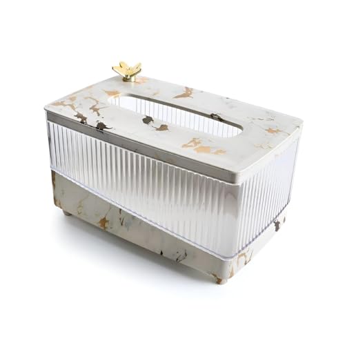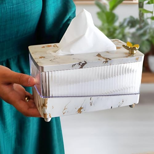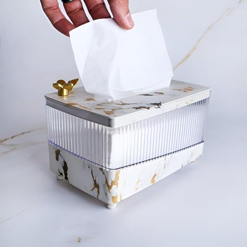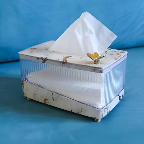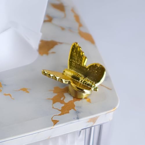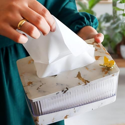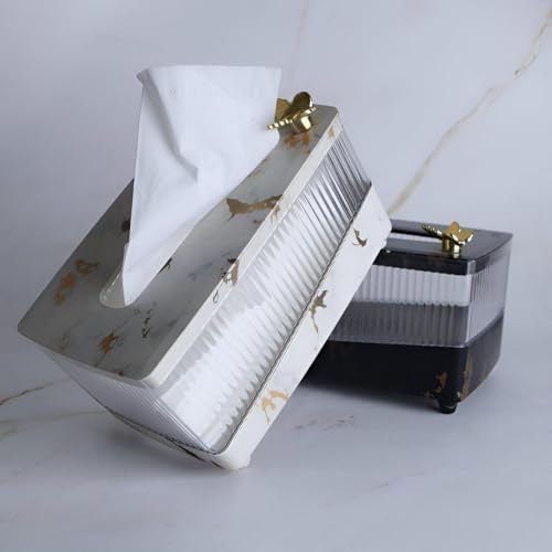 - This acrylic tissue box holder features a marble-pattern finish and a gold butterfly accent, elevating bathroom, kitchen, or bedroom décor.