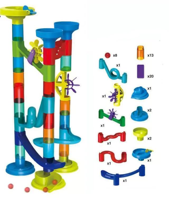 - تصميم شفاف ممتع بصريًا المكعبات الشفافة تسمح للأطفال برؤية حركة الكرات داخل المسارات، مما يزيد من التفاعل والفهم العملي لمبدأ الحركة والجاذبية.