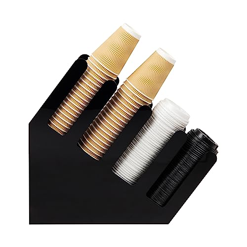 - ULTIMATE BEVERAGE CUP AND LID ORGANIZER: Stack 20 cups per section on this specially designed acrylic cup and lid holder - holds up to 80 cups at one time - substitite lids for cups where needed - great for hot or cold cups 10oz, 12oz or 16oz.