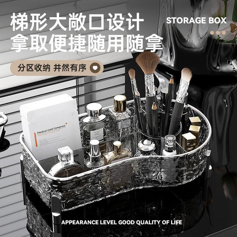 - مادة أكريليك كريستالية فاخرة: مصنوع من الأكريليك عالي الجودة والمقاوم للكسر، يوفر منظم المكياج هذا متانة طويلة الأمد ووضوح استثنائي. يعزز مظهرها الشبيه بالكريستال جمال أي طاولة زينة أو طاولة ملابس، مما يمنح مساحتك مظهرًا عصريًا وأنيقًا مع ضمان دعم قوي لجميع مستحضرات التجميل والإكسسوارات الخاصة بك.