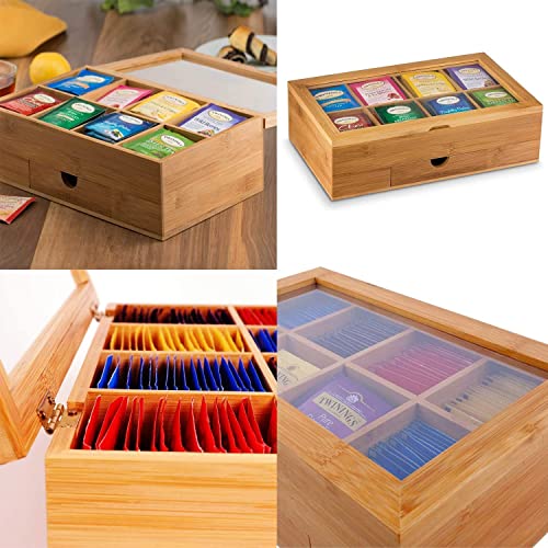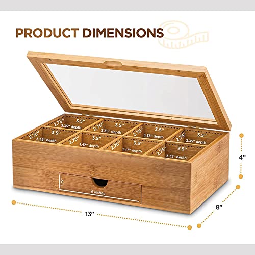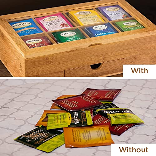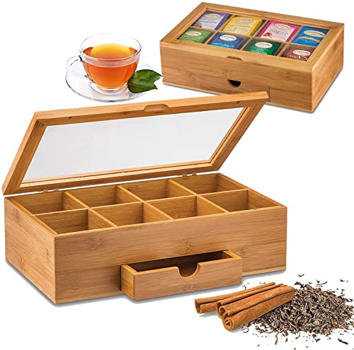Mofish - صندوق تخزين الشاي من الخيزران الفاخر، منظم شاي من الخشب الطبيعي مع درج صغير، 8 مساحات تخزين - لمحبي الشاي من موفيش