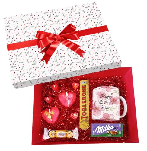 - مجموعة هدايا كاملة: يتضمن صندوق هدايا عيد الأم هذا كوبًا مزخرفًا بتصميم "Happy Mother's Day" وشوكولاتة فاخرة بما في ذلك توبليرون وميلكا وفيريرو روشيه بالإضافة إلى شموع مزخرفة على شكل قلب