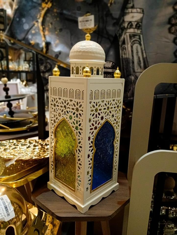 - تصميم إسلامي مميز: فانوس على شكل مسجد بقبة بيضاء مزينة بهلال ذهبي وقباب صغيرة، يضيف لمسة روحانية وجمالية لديكور منزلك
