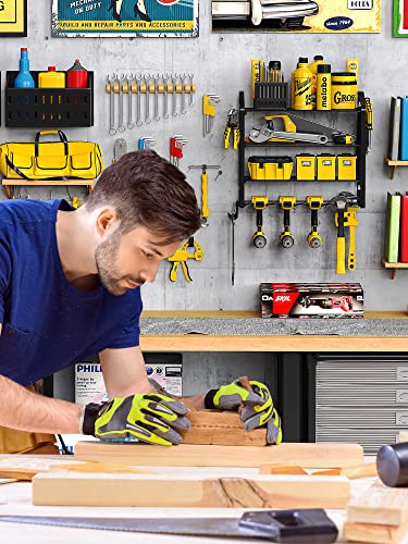 Mutool - رف تخزين منظم للأدوات الكهربائية، حامل يثبت على الحائط لـ 4 أدوات شنيور كهربائية بتصميم شبكي مضاد للسقوط، رف أدوات مع رف مفك جانبي وخطافات للجراج وورشة العمل من موتول (أسود 2)