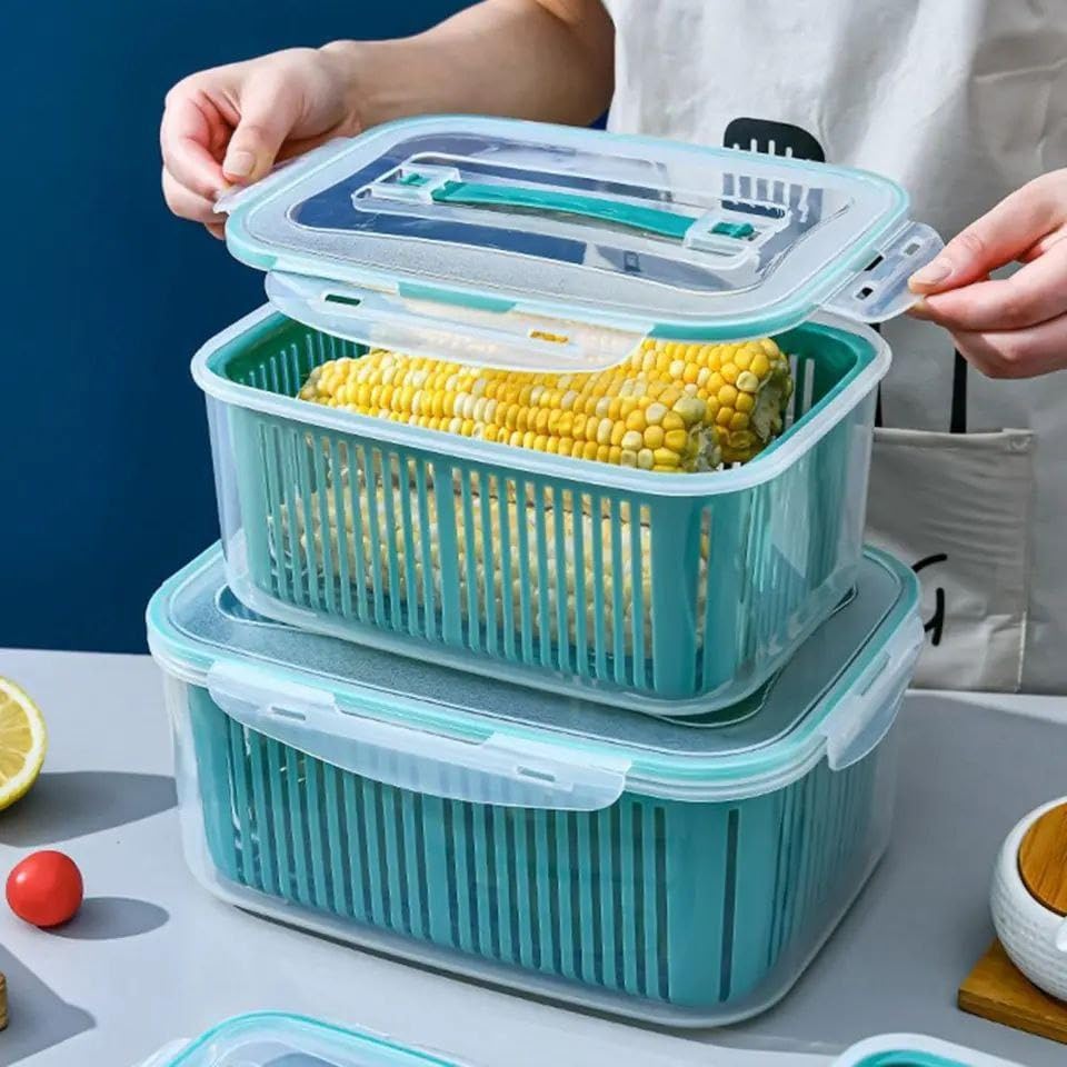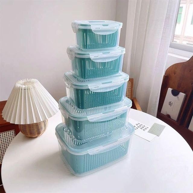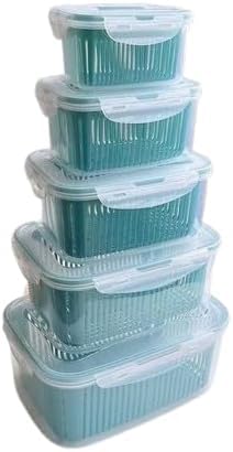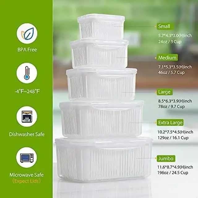 - [ تصميم عملي 5 في 1 : ] يتكون الطقم من 5 علب عملية مختلفة الأحجام، كل علبة مزودة بمصفاة داخلية تساعد على تصفية الخضروات والفواكه بسهولة وتحافظ عليها طازجة.