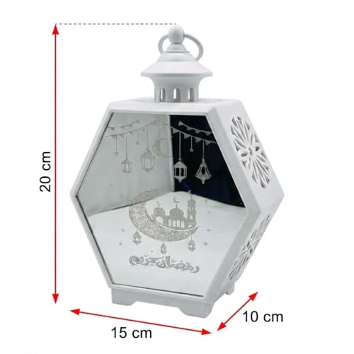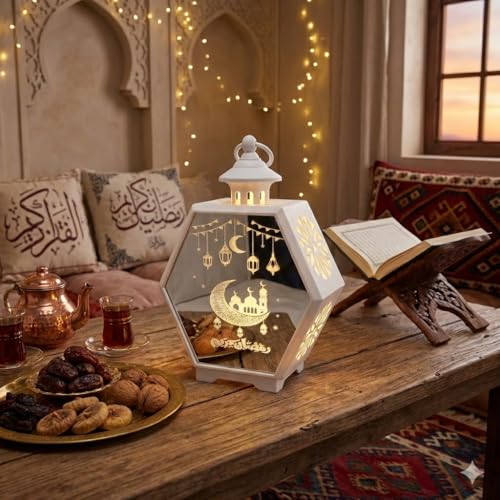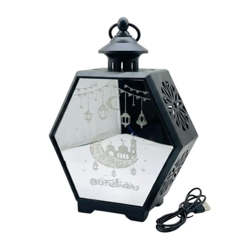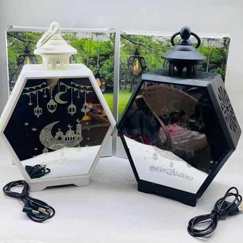 Next store - فانوس رمضان سداسي "المرآة السحرية" من Next Store ، مصباح زينة بواجهة عاكسة ورسومات مسجد وهلال، ديكور مضيء للمنزل (اسود)