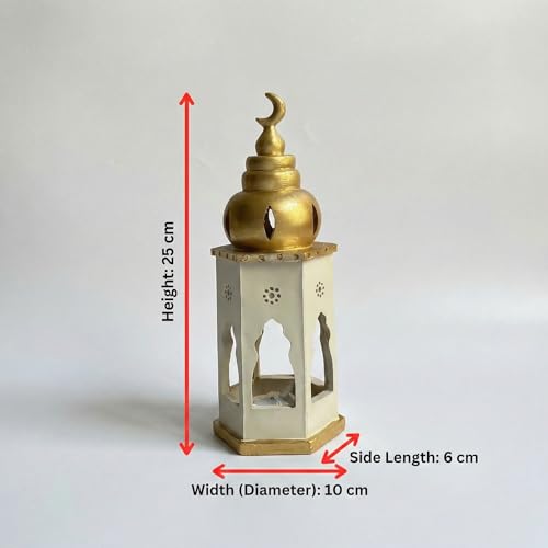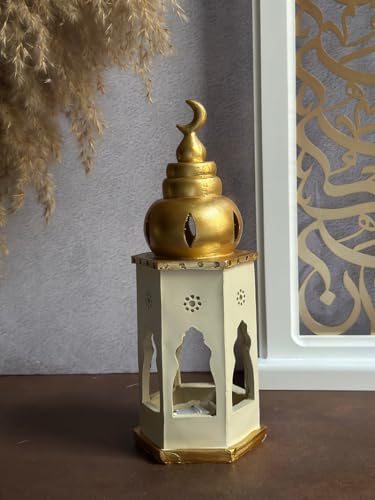 Next store - فانوس رمضان "المنارة البيضاء" السداسي، من Next Store مصباح زينة خشبي باللون الأبيض والذهبي، قبة بهلال ونوافذ مفرغة، ديكور منزلي عصري
