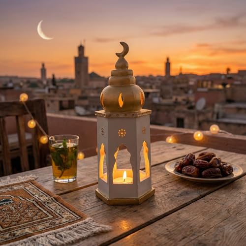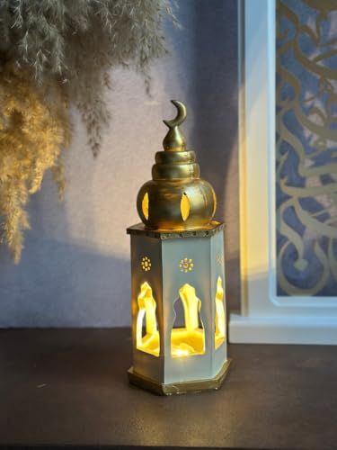 - أناقة الأبيض والذهبي: يتميز الفانوس بمزيج لوني ساحر، حيث يطغى اللون الأبيض المات (Matte) على الهيكل ليمنحه مظهراً عصرياً ونظيفاً، بينما تضيف اللمسات الذهبية في القبة والقاعدة طابعاً احتفالياً فاخراً.