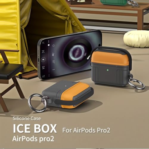 Next store - جراب مقاوم للماء لسماعات ايربودز برو الجيل الثاني من نيكست ستور حماية السيليكون الممتاز 2 يدعم الشحن اللاسلكي مضاد للصدمات بحلقة تثبيت وضوء LED مرئي رمادي - برتقالي للجنسين