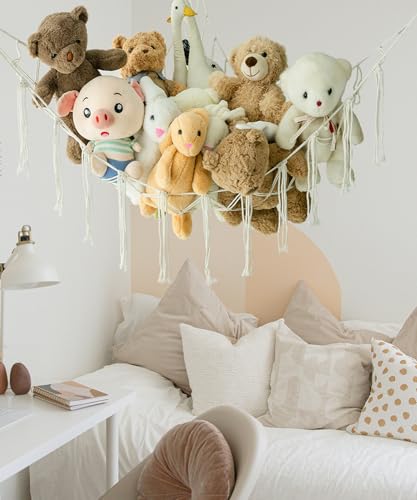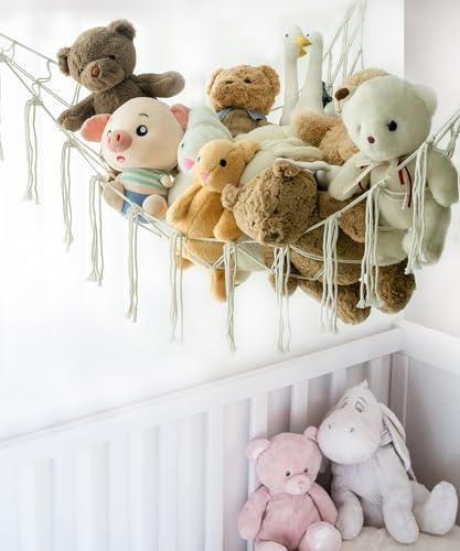 NingHoms - شبكة ارجوحة حيوانات محشوة من نينغهومز مقاس 55 انش، منظم شبكي للحيوانات المحشوة للتعليق في الزوايا، حامل منظم للحيوانات المخملية، ديكور حائط لغرفة الاطفال وغرفة النوم، شبكة حيوانات محشوة، بيج