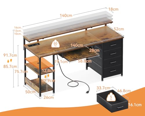 ODK - مكتب من او دي كيه مع 4 ادراج، مكتب كمبيوتر مع مقبسين ومنفذي شحن USB، طاولة كمبيوتر مع رف،