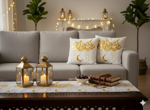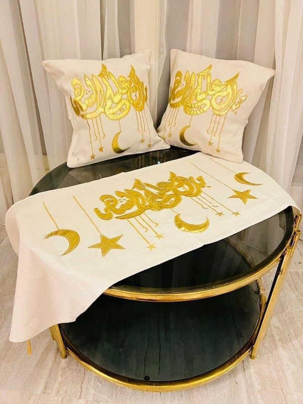 • اووبس - مجموعة ديكور رمضان الفاخرة المكونة من 3 قطع تتضمن 2 غطاء وسادة فاخر مزين بالذهب ومفرش طاولة إسلامي مطابق لمظهر كامل وأنيق.