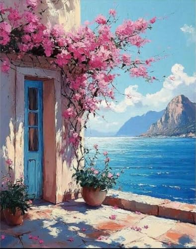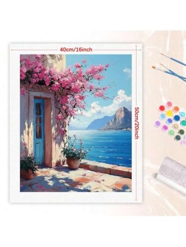 Generic - Paint by Numbers Kit, Mediterranean Seaside with Pink Flowers, 40x50 cm, Complete Set with Brushes and Paints