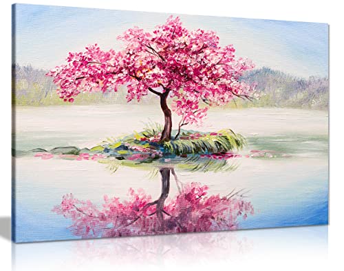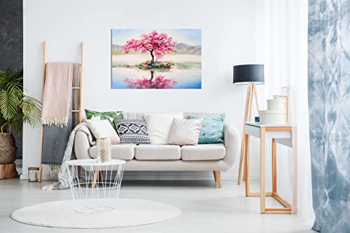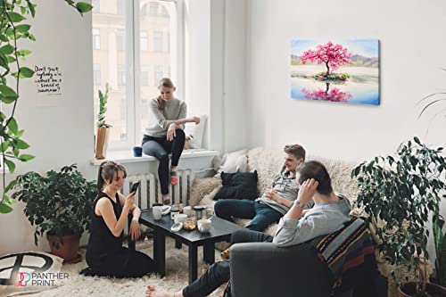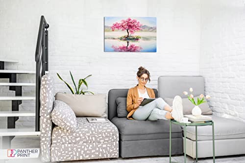 Panther Print - Panther Print Japanese Oriental Cherry Tree on Lake Painting Canvas Wall Art Picture (18x12)