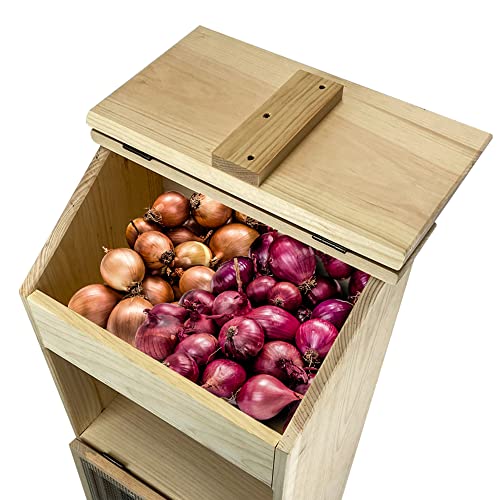 - AMISH-MADE FURNITURE: Handcrafted in Lancaster, PA, by expert Amish woodworkers, each beautiful bread bin is made of pine wood to resist decay and rot. It also includes wire mesh in the doors. This potato and onion storage container can also be used as a bread box for the kitchen countertop.