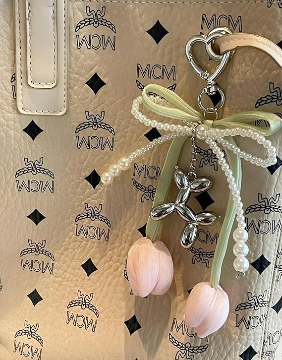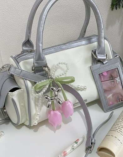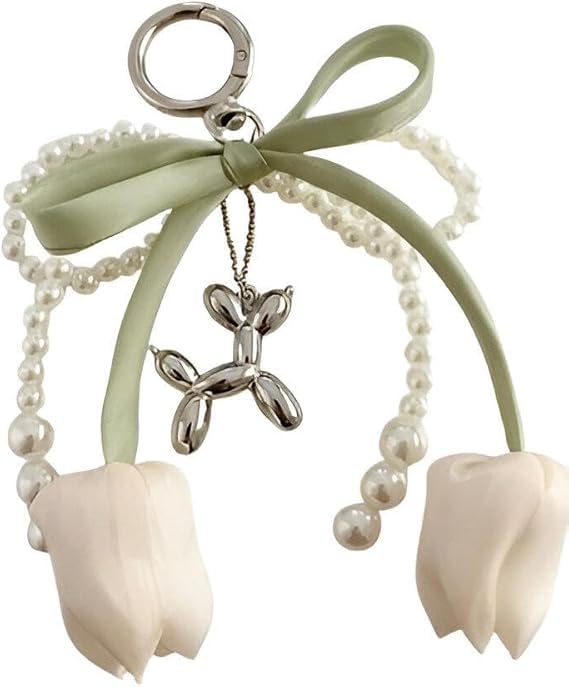 3D Artificial Tulip Flowers, Silver Metal Balloon Dog Necklace, Green Satin Bow Ribbon, White Pearl Chain, Silver Heart Keyring, Multi Layer Design, Suitable for Bags and Keys
