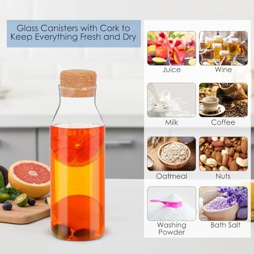 - CORK LID: The cork lid not only adds a touch of natural rustic to your drinks but also seals the glass bottle securely, keeping your drinks fresh, and perfect for storing water, milk, tea, coffee and juice. These glass canisters are reusable, the glass bottle can be washed by dishwasher, but the cork can only be hand washed and kept dry.