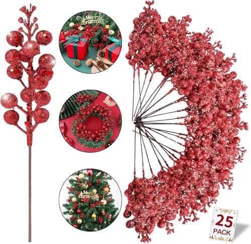 Pomefar - 25Pcs Christmas Glitter Berries Stems, Christmas Tree Decorations, DIY Christmas Wreath, Crafts, Holiday and Home Decor (Red)