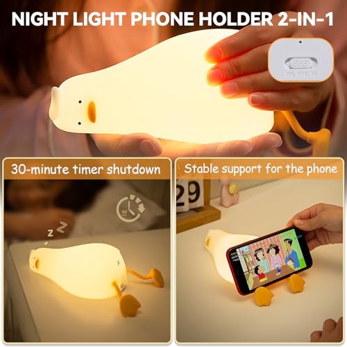 PQETBV - مصباح ليد ليلي على شكل بطة من السيليكون مع وظيفة حامل للموبايل بتصميم قابل لإعادة الشحن، ضوء ليلي محمول مع وظيفة مؤقت للكريسماس للبنات والأولاد من بي كيو اي تي بي في