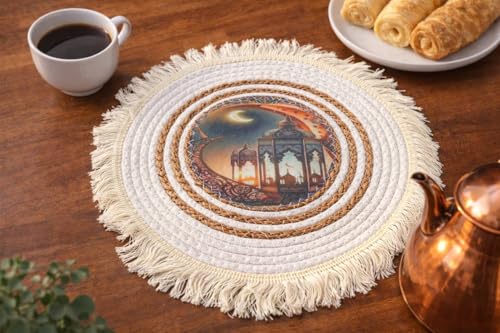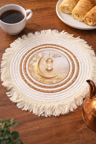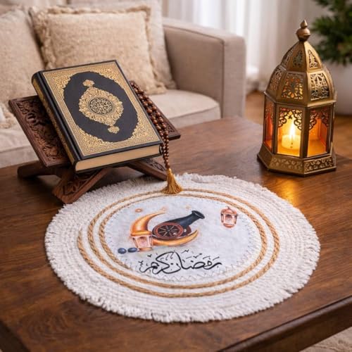 - تصميم رمضاني أنيق: يتميز بشكل دائري مع لمسات حبل مزخرفة، وحواف شراشيب ناعمة، وطباعة "رمضان كريم" جميلة تضيف الدفء والسحر الاحتفالي إلى أي إعداد طاولة رمضانية