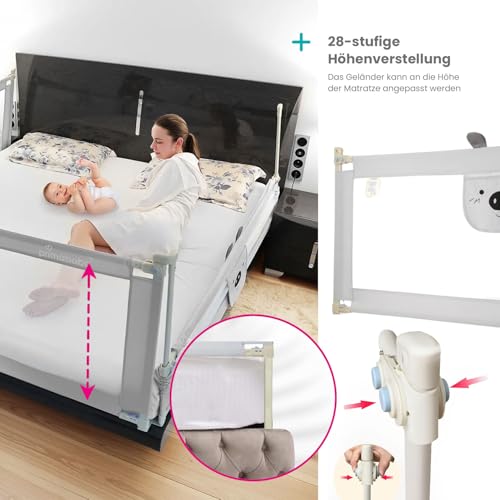 • ADJUSTABLE HEIGHT: thanks to our seven-step height adjustment system, the protective barrier can be adjusted from 68 to 95 cm in height, depending on the height and development of the child. Bed railings fit mattresses 15-30cm thick