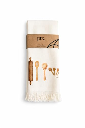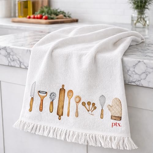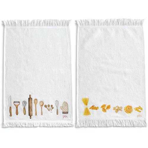 Printex.EG - فوط مطبخ قطن 100%، فوط أطباق فائقة الامتصاص بوزن 400 جم/م²، سريعة الجفاف، بأطراف مزينة بشراشيب من برينتكس.اي جي، 50 × 30 سم، لون أبيض (off White)، 2 قطعة، تصميم رسومات بشكل مكرونة، أدوات الطهي