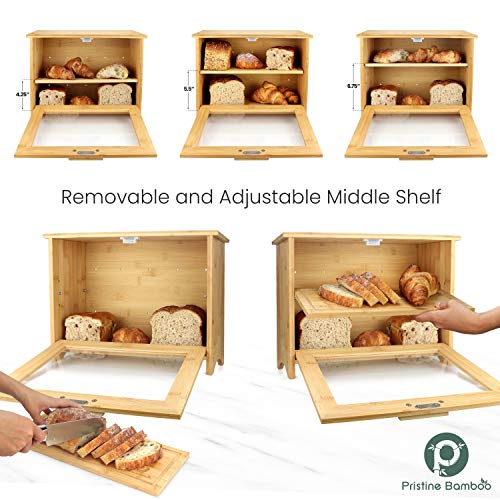 Pristine Bamboo - Bread Box for Kitchen Countertop - Double Layer Bread Storage Bin with Clear Windows - Rustic Farmhouse Style Bread Bin, Wooden Large Capacity Bamboo Food Storage Bin (Self-Assembly)