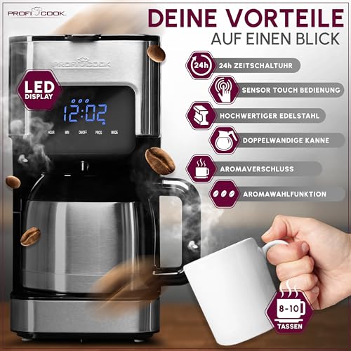 Profi Cook - ماكينة تحضير القهوة بالتنقيط من بروفي كوك بسعة 1.2 لتر، مع مؤقت ومستشعر تحكم باللمس وقارورة حرارية مزدوجة الجدران، من الفولاذ المقاوم للصدأ