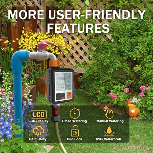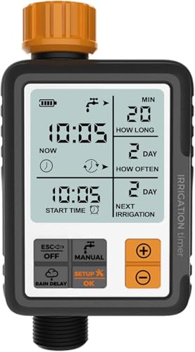 - Tired of dull and boring watering tasks that requires a lot of effort? Just try this Smart Water Timer for Garden will definitely take your watering routine to the next level! Large and clear LCD display for easy reading Programmable watering duration: from 1 second up to 300 minutes Adjustable watering frequency: from every 1 hour to once every 15 days Manual watering option without disturbing the schedule Rain delay function for 24, 48, or 72 hours Two dial buttons and one control button for easy operation Waterproof design (IP44 rating) for outdoor use Low battery indicator to prevent interruption