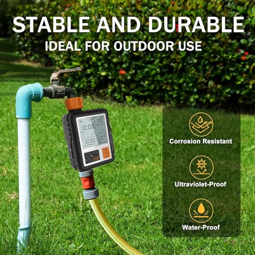 - Smart Automation - Weather Adaptation - Customizable Zones - Water Conservation - Remote Access - Weatherproof Design - Energy Efficient - Easy Setup 【Waterproof & Rain Delay】The top connector is made of reinforced nylon fiber material, which make it much more impact-resistant and wear-resistant than ABS or plastic. Waterproof battery case with internal rubber ring around the cover protects the batteries inside. With rain delay mode, your programmed schedule will be paused for 24, 48, or 72 hours, and will be automatically resumed.