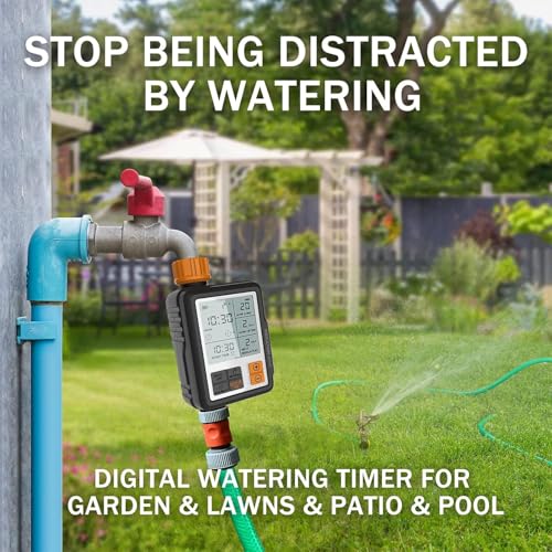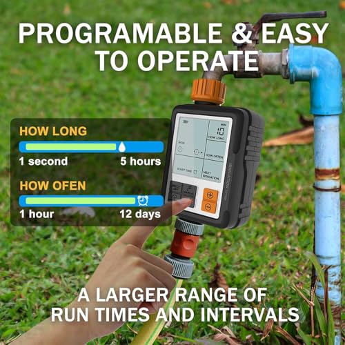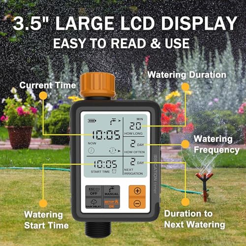 - 【Large LCD Screen Display】Extra-large screen make everything clear for you at a glance. It can display the watering time, watering frequency, power and other detailed content, convenient and easy to read. 【Automatic and Flexible Programming】The Monoptilon Sprinkler for yard provides wider range of irrigation duration and frequency. The watering duration ranges from 1s to 300min, and watering frequency from 1h to 12h or 1 day to 15 days. Make watering schedule fully customizable. This water timer can apply to drip irrigation system, sprinkler controller.