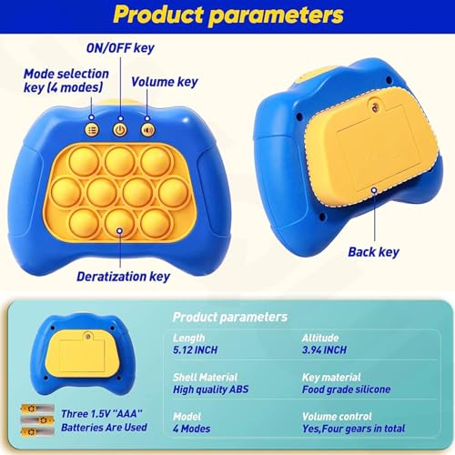 • المواد: بلاستيك ABS البطارية المستخدمة: 3 بطاريات AAA7 1.5 فولت (مزودة ذاتيًا) الحجم: 13 * 5.8 * 10.2 سم لون المنتج: أبيض، برتقالي، أزرق، وردي، التكوين: دليل باللغة الإنجليزية. وضع المنتج: وضع ثوري، وضع الذاكرة، وضع النتيجة، وضع متعدد الأشخاص، التدريب على التفكير: تدريب التركيز؛ التنسيق بين اليد والعين؛ تخفيف ذلك. تحسين الذاكرة