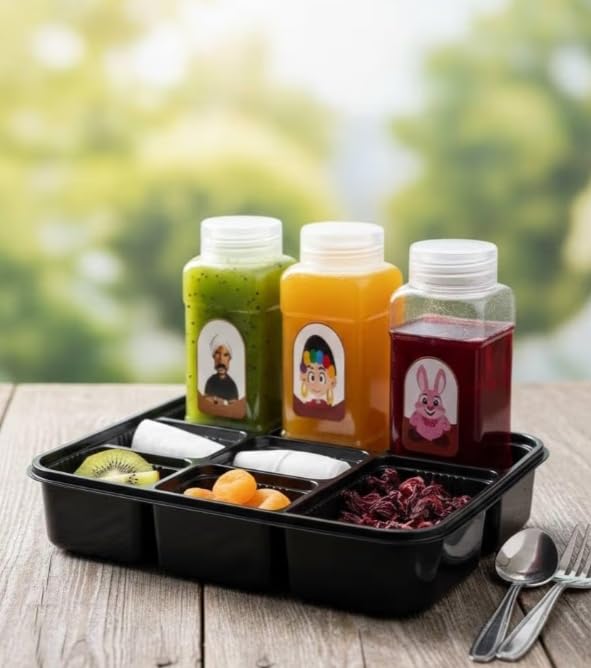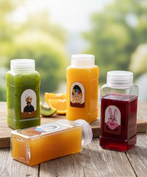 - محتوى العبوة: مجموعة من 4 زجاجات عصير بلاستيكية شفافة بسعة 125 مل لكل زجاجة، مثالية للمشروبات الباردة والعصائر الطازجة