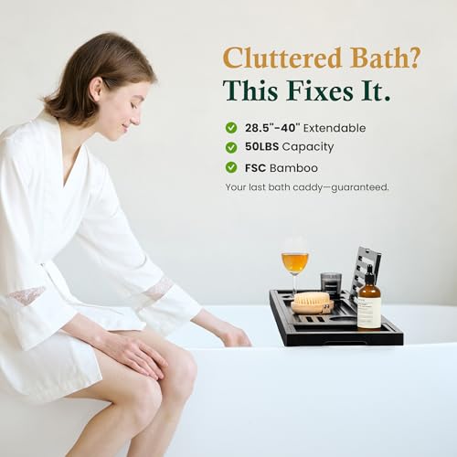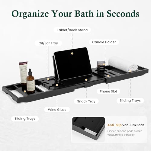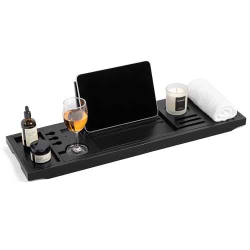 Realgulf - Bamboo Bathtub Tray Caddy - Splash-Proof Adjustable (28.5-40") with Wine Holder, Tablet Stand & Non-Slip Grip | Spa-Grade Organizer for Bath Essentials & Reading- Black