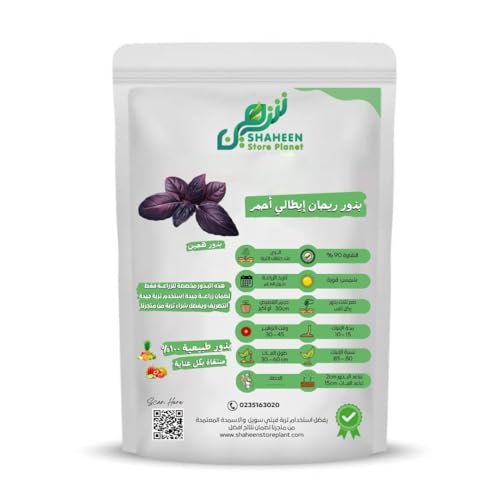 - بذور ريحان إيطالي أحمر: عبوة تحتوي على 30 بذرة طبيعية بنقاوة وانبات 90% لزراعة نبات الريحان الإيطالي الأحمر ذو الأوراق الأرجوانية المميزة