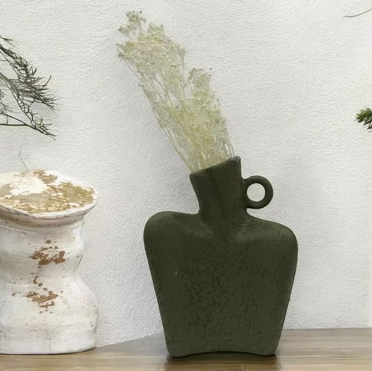 Generic - مزهرية زهور من السيراميك بتصميم ريفي مع مقبض، اخضر داكن، تصميم ديكور عصري