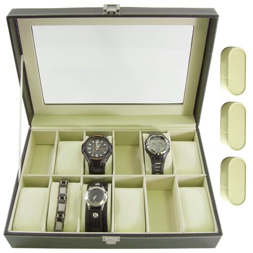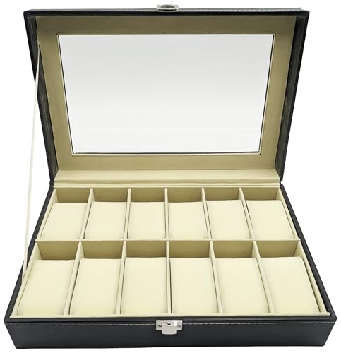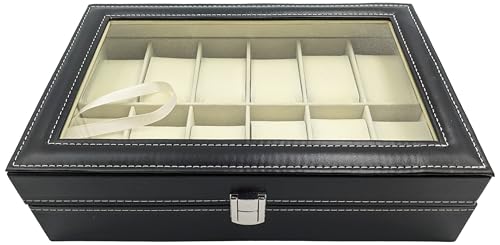 SciencePurchase - صندوق منظم كبير للساعات بلون أسود وزجاج علوي مناسب لـ 12 ساعة، علبة منظم مجوهرات للرجال من ساينس بريشوس