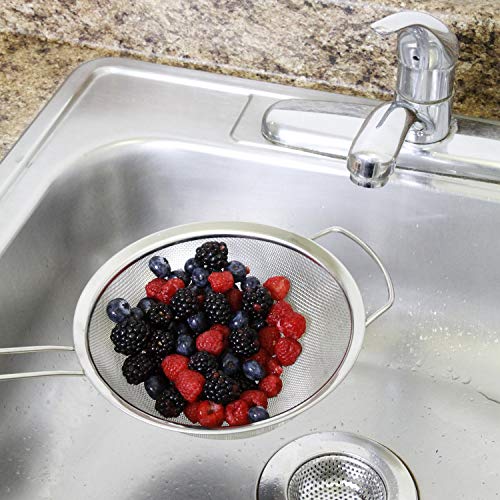 - مصافي مطبخ من فولاذ مقاوم للصدأ لتصفية الشاي والعصير والبيض مع شبكة دقيقة ومقابض، 3 قطع