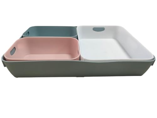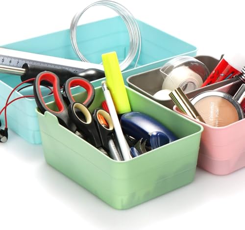 - Practical set: the four storage boxes in three different sizes ensure order on the desk, in the drawer or in the bathroom cabinet Functional design: the desk organiser made of flexible and robust material can be arranged and used and can be stacked inside each other Multifunctional: the drawer boxes can store office supplies, make-up, cosmetics, make-up accessories, cutlery, kitchen utensils or hygiene items Space-saving: when not in use, the coloured storage boxes can be stored in a cupboard, shelf or drawer thanks to the stacking function